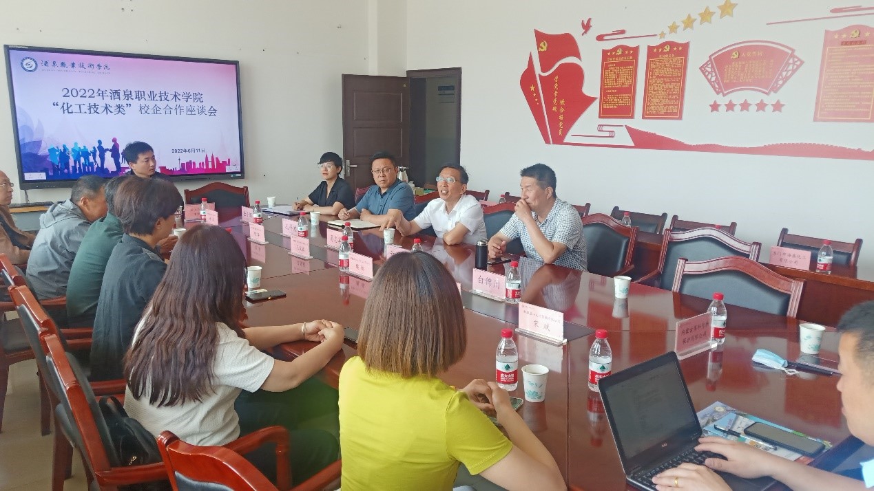 6月11日上午,化工学院在逸夫楼A213会议室召开了校企合作座谈会。学校党委书记、校长易志军出席会议,新疆和山巨力化工有限公司副总经理魏榕、新疆蓝山屯河聚酯有限公司人力资源部部长宋斌、甘肃华实生物科技有限公司副总经理王发森、甘肃泽佑新材料有限公司总经理许勇、新疆宜化化工有限公司人力资源部招聘主任马会芹、甘肃泰富德新材料有限公司总经理仇华、浙江石油化工有限公司人力资源部经理陈国刚、浙江省嘉兴市秀洲区人力资源和社会保障局大学生社会工作服务中心副主任樊鹏奋、新疆蓝山屯河能源有限公司人力资源部部长滕书仪、内蒙古莱科作物保护有限公司人力资源部部长杨阳等优秀企业代表和化工学院领导班子参加座谈。座谈会由化工学院党支部书记、院长许新兵主持。