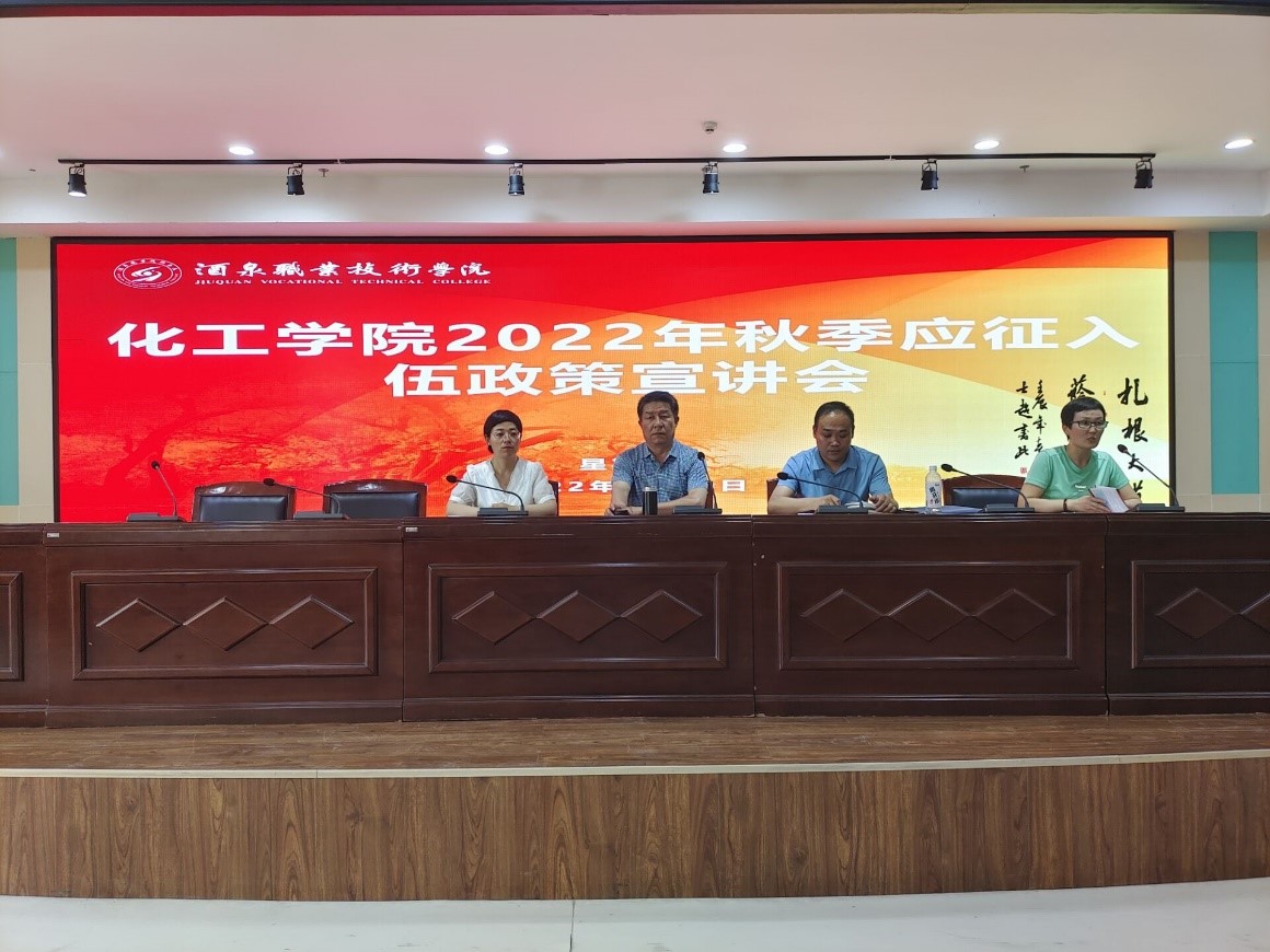 6月29日下午,化工学院在图书馆四楼会议室召开了2022年秋季大学生征兵宣传活动。化工学院党支部书记、院长许新兵、副院长任小娜,征兵干事易建红及辅导员、班主任出席会议,化工学院近400名在校生聆听了宣讲;会议由副院长白锦川主持。
