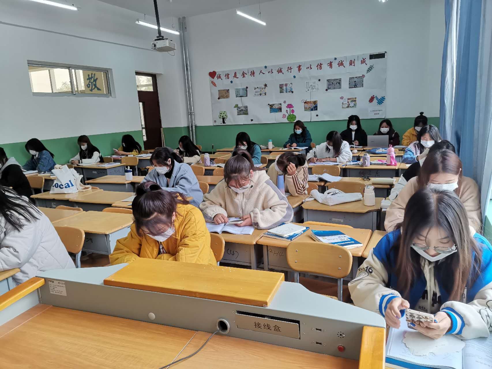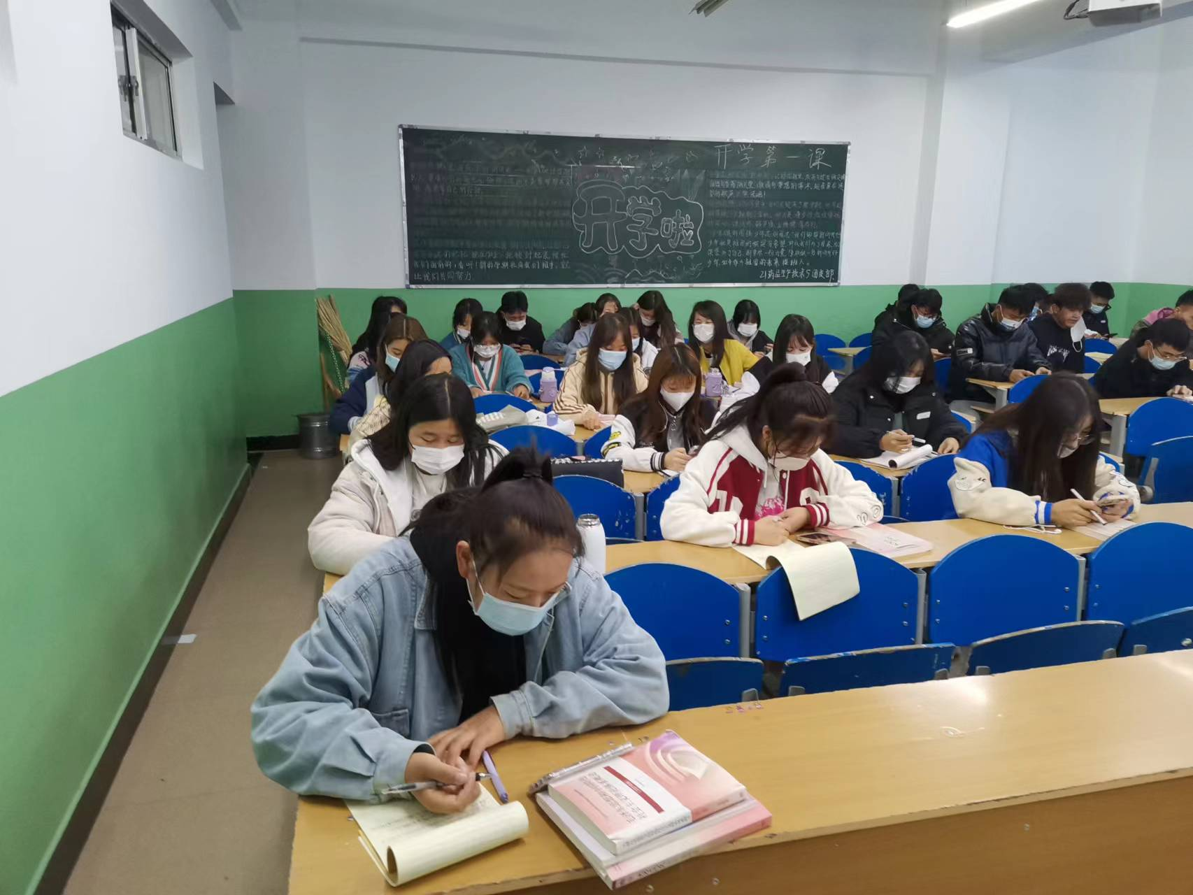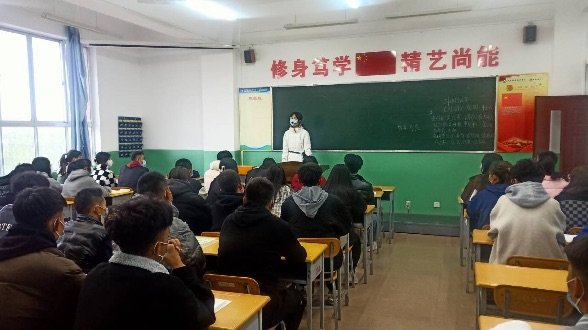 线上教学的教室里像平时一样坐满了上课班级,每位同学按照要求佩戴口罩、耳机,认真听讲的同时做笔记、回答问题。留校教师正常组织学生进行课堂教学,其它留校教师在对上课班级进行督促巡查。教学督导对线上教学进行了督导听课。