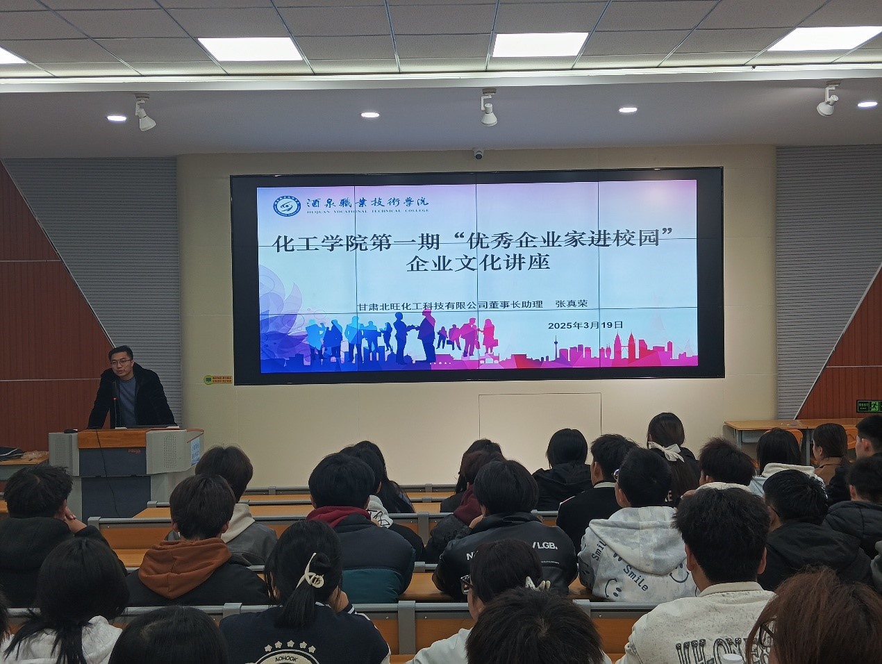 3月19日晚,化工学院在行知楼西阶梯教室开展新学期第一期“优秀企业家进校园”活动。甘肃北旺化工科技有限公司董事长助理张真荣、人力资源部经理徐婷、安环部部长翟向向受邀参加,化工学院 2023级238名同学聆听讲座。