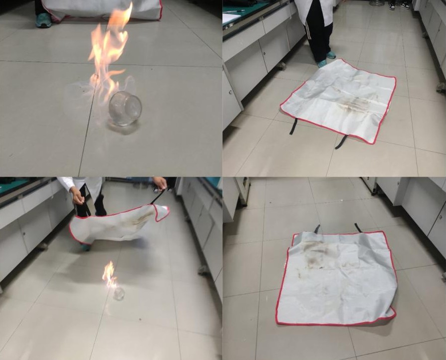 首先进行的是实验室化学品火灾扑救演练,针对化工实验室危化品、易燃易爆药品试剂集中等特殊风险点,演练模拟实验室因操作不慎打翻酒精灯引发小型化学品火情。现场人员迅速启动应急预案:实验员与安全负责人果断采用窒息法灭火,通过灭火毯覆盖着火点隔绝氧气使火熄灭。实验室主任尚玉倩老师给同学们现场讲解了不同火情下,应该选择不同的灭火器材,如有机化学品火灾切忌用水扑救,应该选择灭火毯和沙土灭火,阻断燃烧条件,避免二次反应,同时,她还给同学们演示了干粉灭火器“提、拔、握、压”操作要领,参演师生分组实操,在“手把手”教学中掌握了不同火情下灭火工具的选择与规范操作流程。