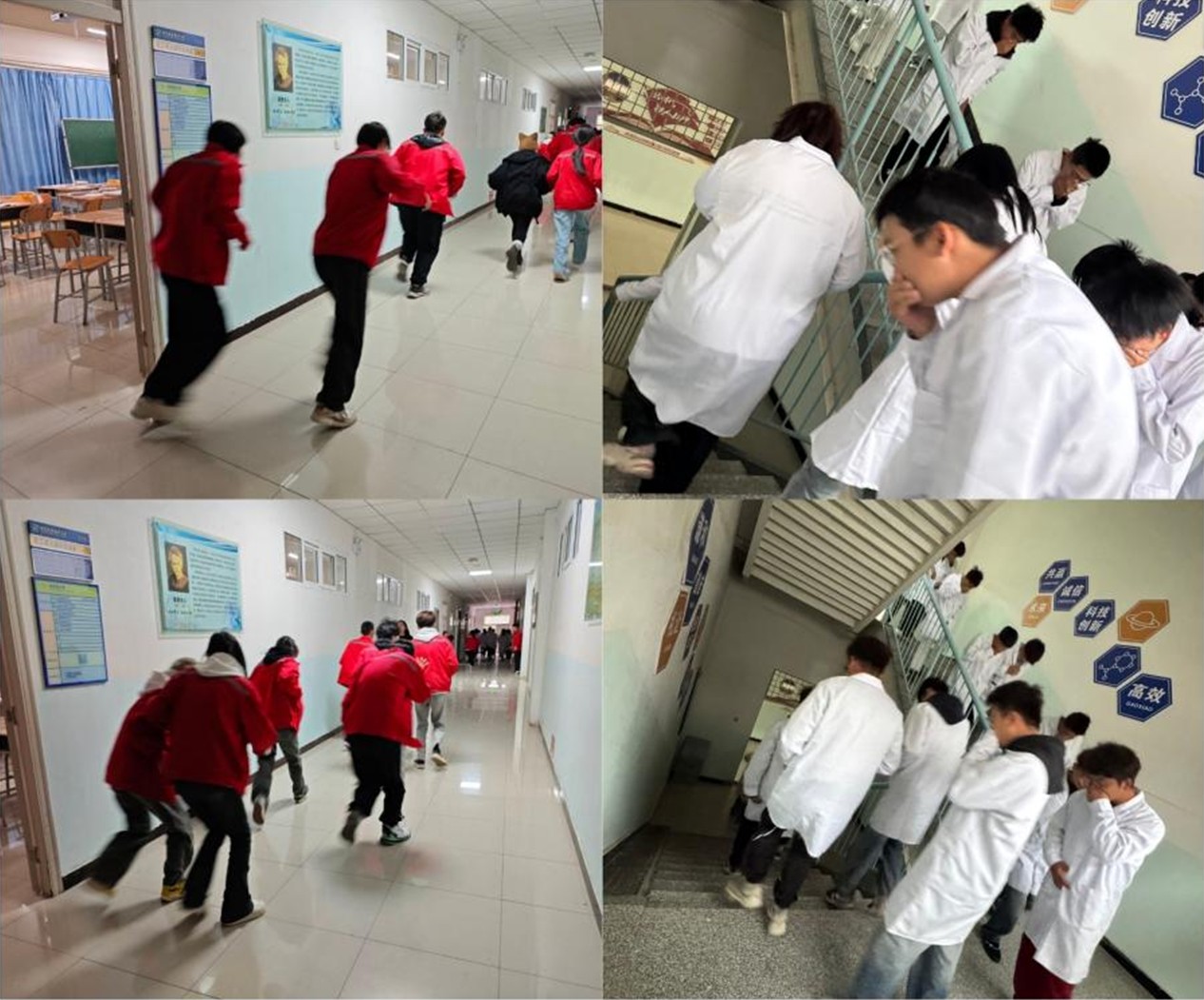 随后进行了实验室火灾应急逃生模拟演练,随着烟雾报警器响起,实训楼进入“火灾逃生”情景。各实验室人员用湿毛巾捂住口鼻,沿墙弯腰低姿前行,严格按照安全标识指引,在3分钟内有序撤离至室外集合点。疏散过程中,楼层安全员实时巡查实验室情况及人员撤离状态,确保“不落一人”。通过演练进一步强化了师生“遇险不慌、有序撤离”的安全素养。