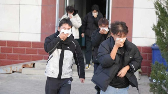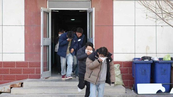 演练正式启动后,模拟火灾信号及时传递。同学们沉着应对,迅速用湿毛巾捂住口鼻,保持弯腰低姿的安全姿势,严格遵循预定路线快速有序撤离宿舍。整个疏散过程紧张高效、秩序井然,充分展现了师生良好的应急素养和协同配合能力。