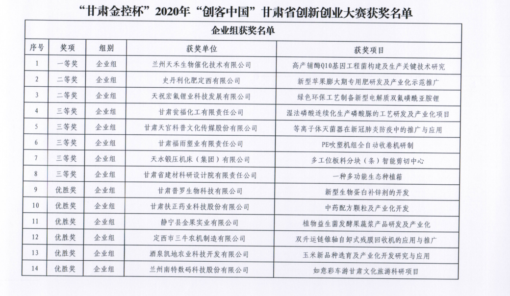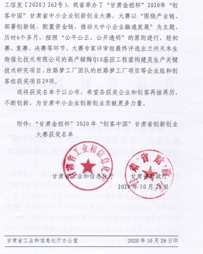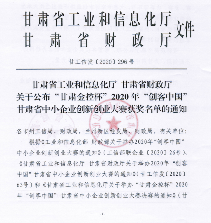 甘肃省工业和信息化厅 甘肃省财政厅关于公布“甘肃金控杯”2020年“创客中国”甘肃省中小企业创新创业