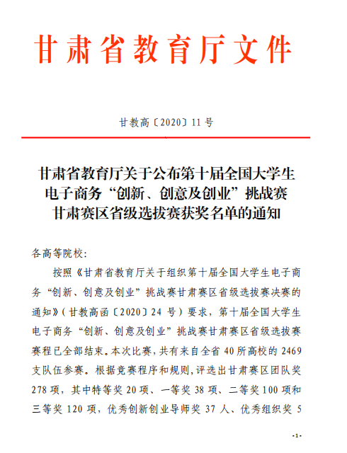 甘肃省教育厅关于公布第十届全国大学生 电子商务“创新、创意及创业”挑战赛 甘肃赛区省级选拔赛获奖名单