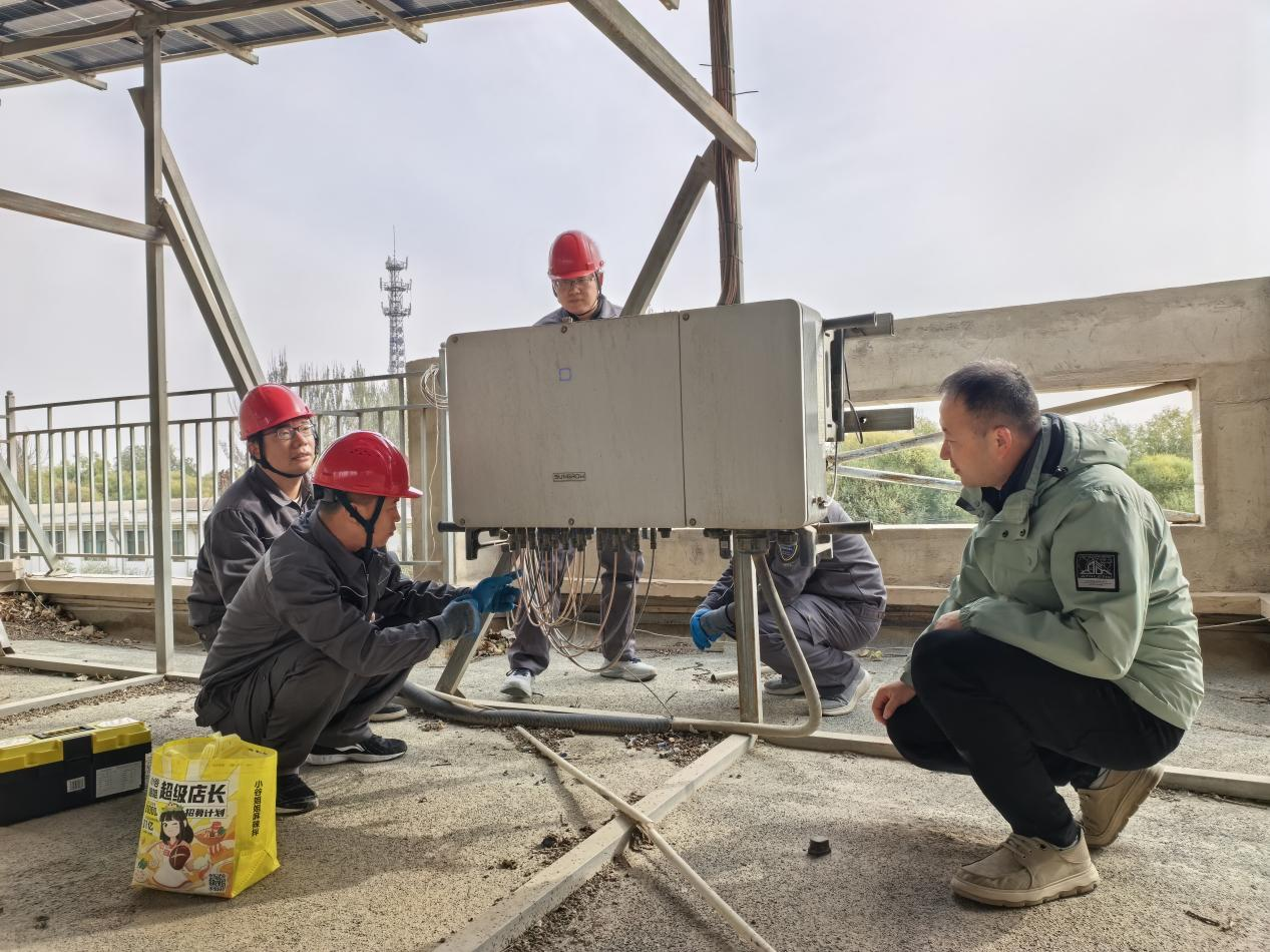 二是现场检修排除隐患。专业教师深入光伏电站,对组件、逆变器、汇流箱、线路等关键设备展开全面检测。现场发现光伏板积尘影响发电效率,部分逆变器报警、输出不稳,另有线路接头老化松动,存在过热短路隐患。针对上述问题,教师团队立即开展组件清洗、逆变器复位调试及老化线缆更换紧固工作,及时消除隐患,保障了电站安全稳定运行。