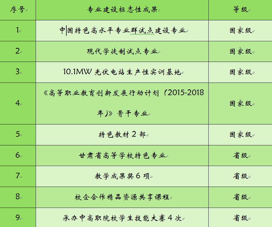 校外与涵盖太阳能应用行业全产业链的浙江晶科、银川隆基、东方电气等7家优质企业签订校企合作协议,建成企业实践教学基地,为打造“双师型”师资队伍和培养本专业复合型人才提供了有力保障。