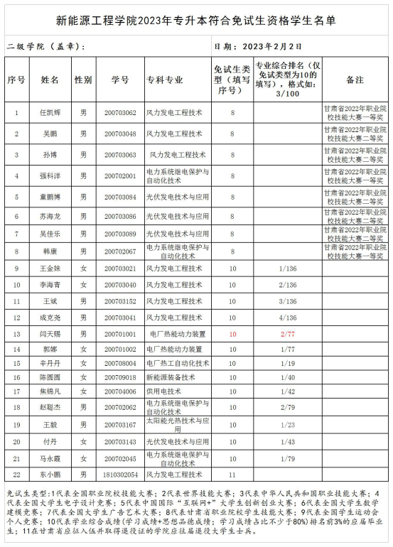 根据《2023年甘肃省普通高校高职(专科)升本科免试生招生工作实施方案》(甘招委发〔2023〕1号)和《酒泉职业技术学院 2023 年高职(专科)升本科考试免试入学考生资格审定办法》的文件精神。按照学生个人申请,各班级推荐,学院审核的程序,本着公平、公正、公开的原则现将我院符合免试生资格学生名单予以公示(详细名单见下表):