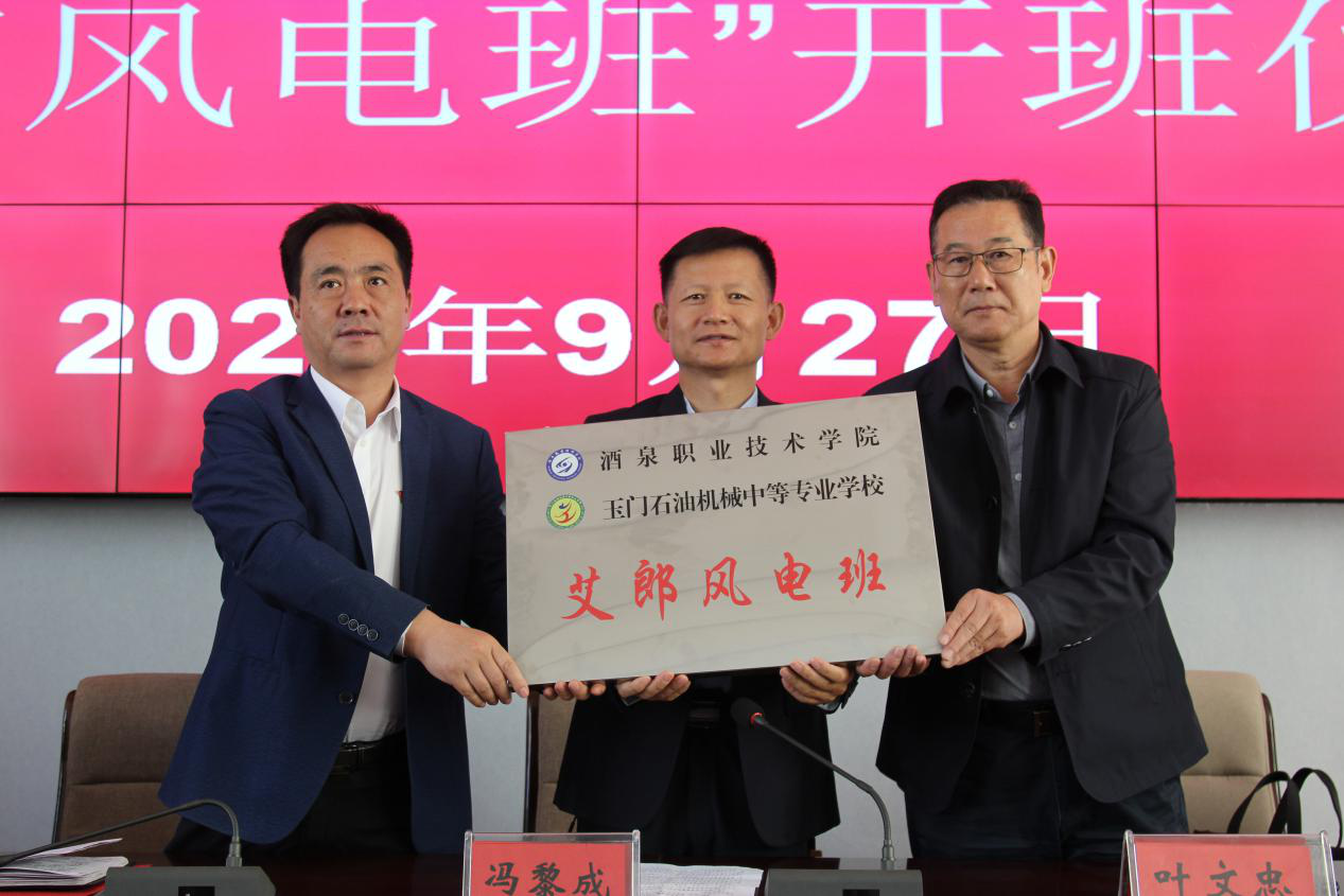 2021年9月27日,我院联合艾郎科技股份有限公司玉门、玉门石油机械中等专业学校在玉门石油机械中等专业学校共同为35名学子举行2021级“艾郎风电班”开班仪式。出席开班仪式的有艾郎科技股份有限公司玉门生产基地副总经理叶文忠、人事部经理郭金双;酒泉职业技术学院新能源工程学院党支部书记、院长冯黎成,副院长张振伟;玉门石油机械中等专业学校党委书记、校长刘小平,副校长马建峰;订单班全体学员及家长。